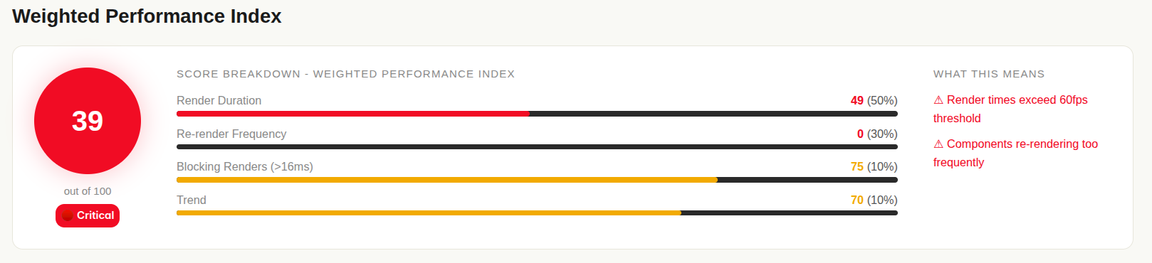 WPI scores your app 0–100 across render duration, re-render frequency, blocking renders, and trend. One number, total clarity.